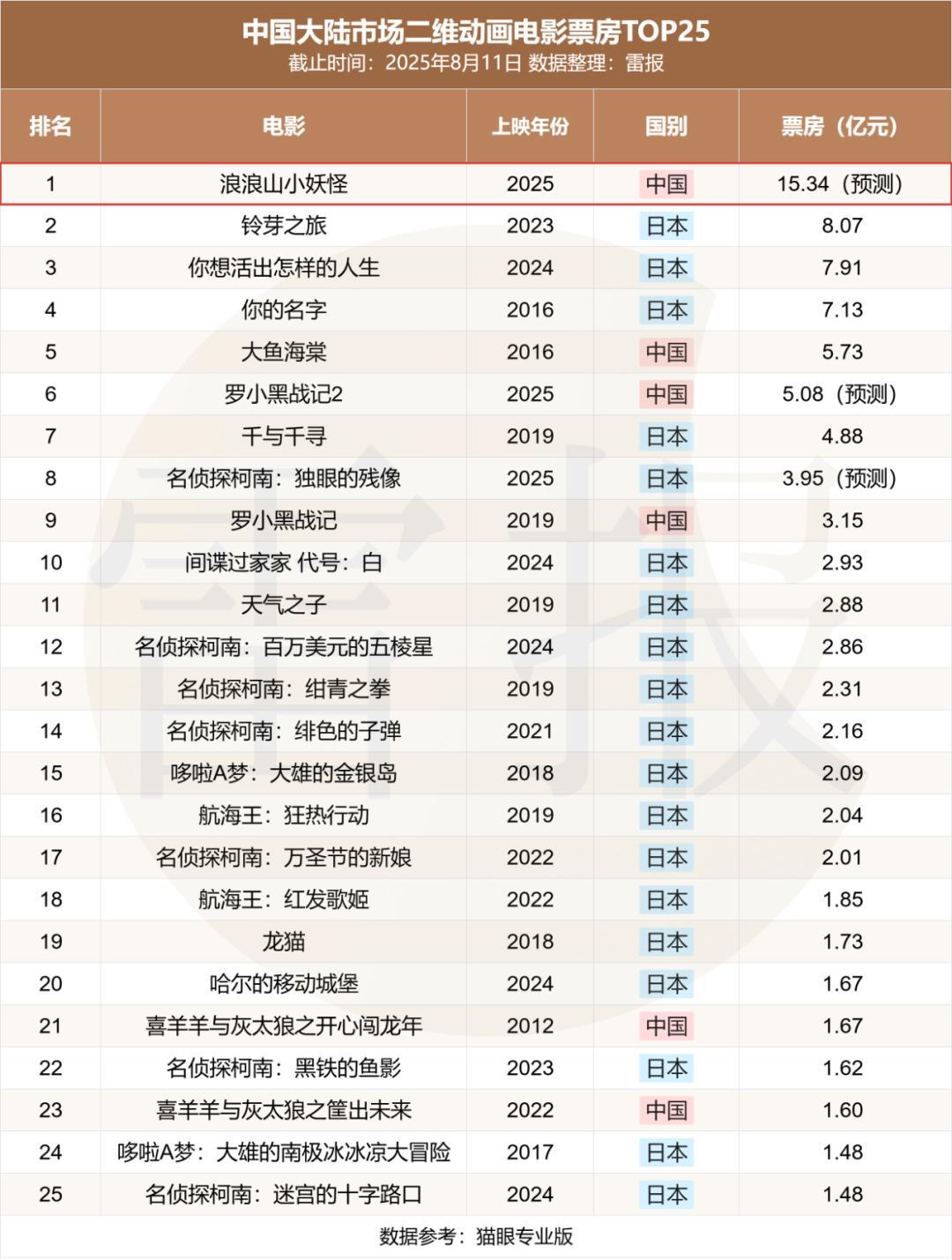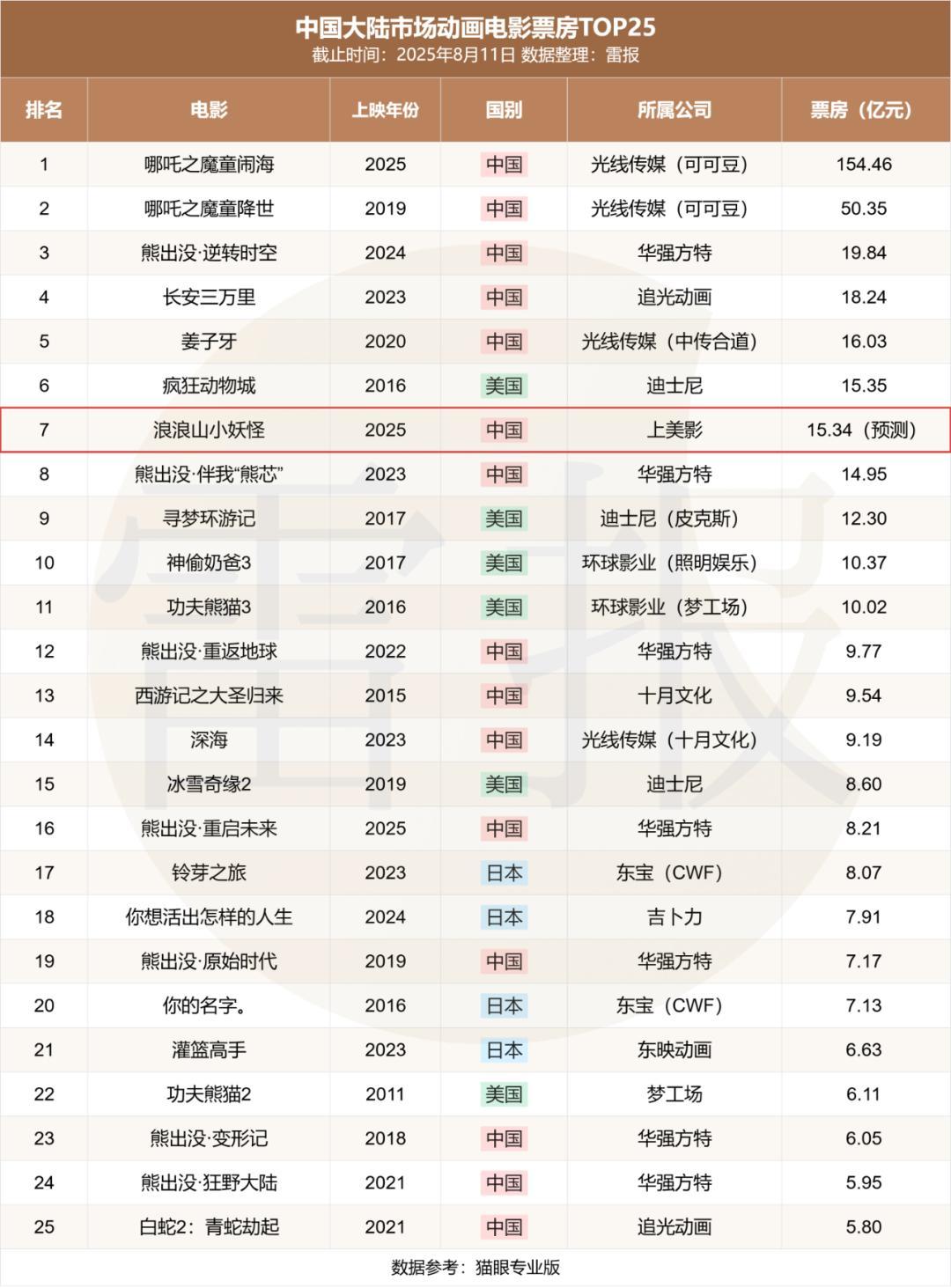 而根据猫眼电影的最新预测,该电影的最终票房预计将达到15.34亿元,距离国内市场动画电影票房排名第6位的《疯狂动物城》仅0.01亿元票房之差,并大幅拉高《铃芽之旅》(8.07亿)创造的中国大陆电影市场的二维动画电影票房纪录。
