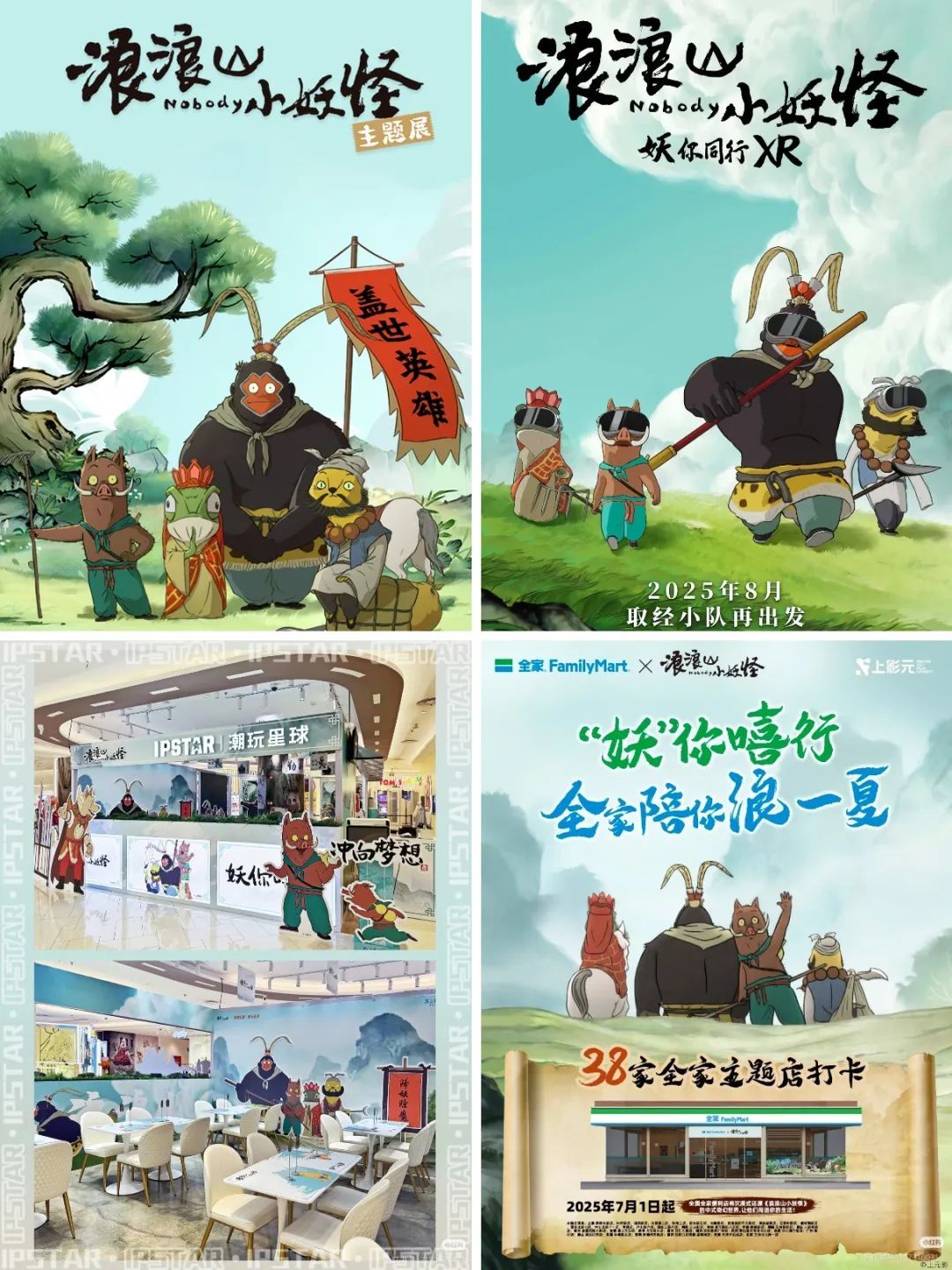此外,《浪浪山小妖怪》至少还与8家公司达成了线下空间授权合作。例如,早在电影上映前的7月22日,上影元授权位于深圳的沉浸式IP乐园光合世界,打造了“妖你嘻行主题展;7月30日,其与潮玩星球合作的主题餐厅便于上海新世界城8楼正式营业,推出多款联名主题餐食饮品和周边;8月1日,又与连锁便利店合作伙伴全家合作,在全国推出了38家联名主题便利店。