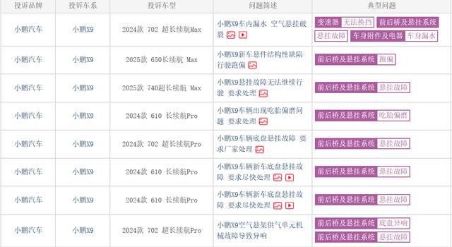 根据质量问题权威投诉平台“车质网”的公开信息显示,在近一个月的MPV质量问题投诉排行榜中,高居榜首的就是小鹏X9,其中大部分的投诉问题都把矛头指向了该车配备的空气悬架,尤其是2024款小鹏X9,更是空气悬架趴窝、异响的集中爆发点,大量车主表示车辆在行驶途中,空气悬架存在异响,更严重的就是塌了,严重影响行车安全,如果要是在高速公路上空气悬架出现趴窝,甚至会导致车毁人亡。