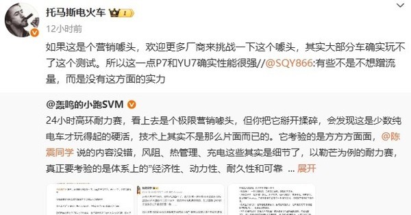 在开启测试之前,曾有汽车博主轮称,24小时高环耐力赛看上去是个极限营销噱头,但你把它掰开揉碎,会发现这是少数纯电车才玩得起的硬活,技术上其实不是那么片面的,它考验的是方方方面面。对此,小鹏汽车副总裁也表示:如果这是个营销噱头,欢迎更多厂商来挑战一下这个噱头。其实大部分车确实玩不了这个测试,所以从这一点来看,P7和YU7确实性能很强。