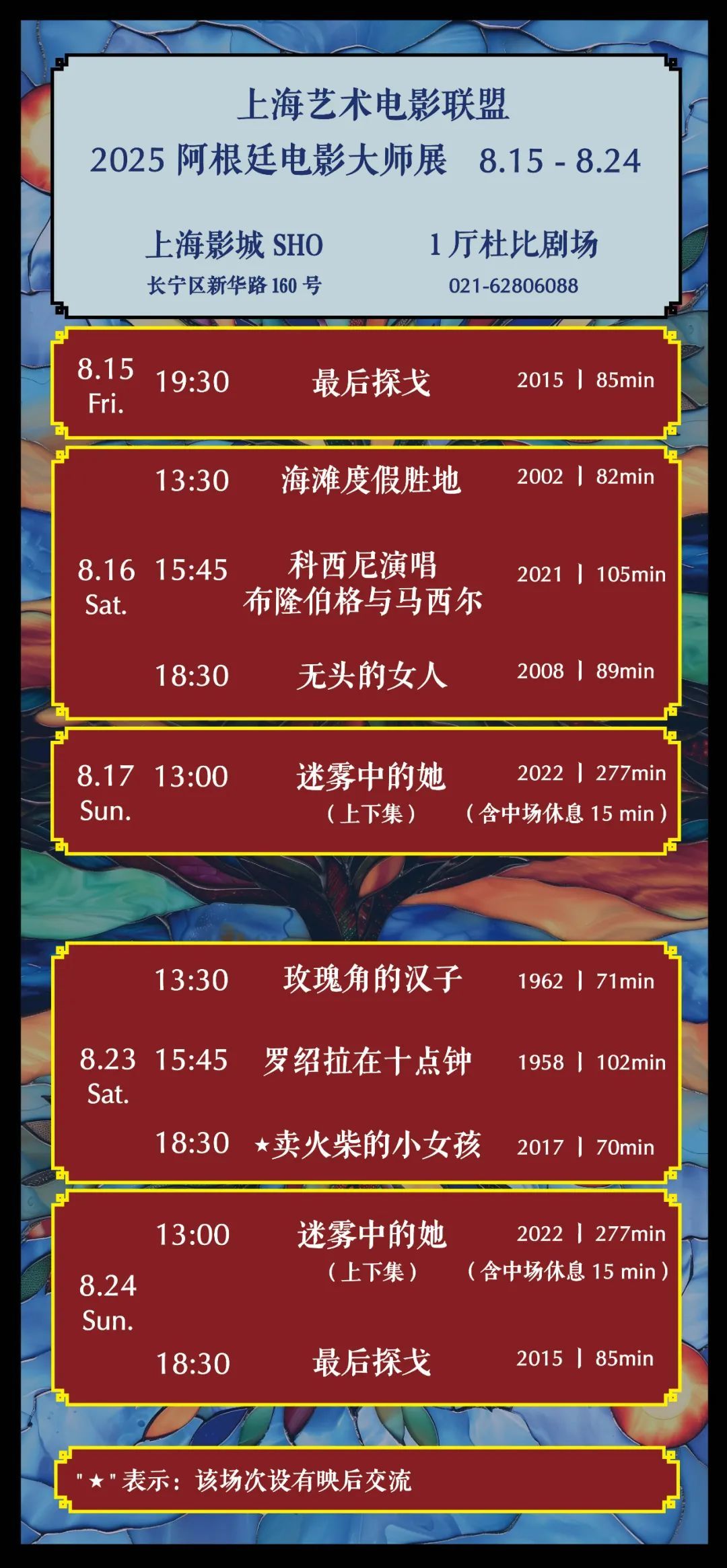 2025年8月15-24日,上海艺术电影联盟与阿根廷驻沪总领事馆在上海影城SHO联合举办阿根廷电影大师展。影展已于昨天中午12点正式开票。