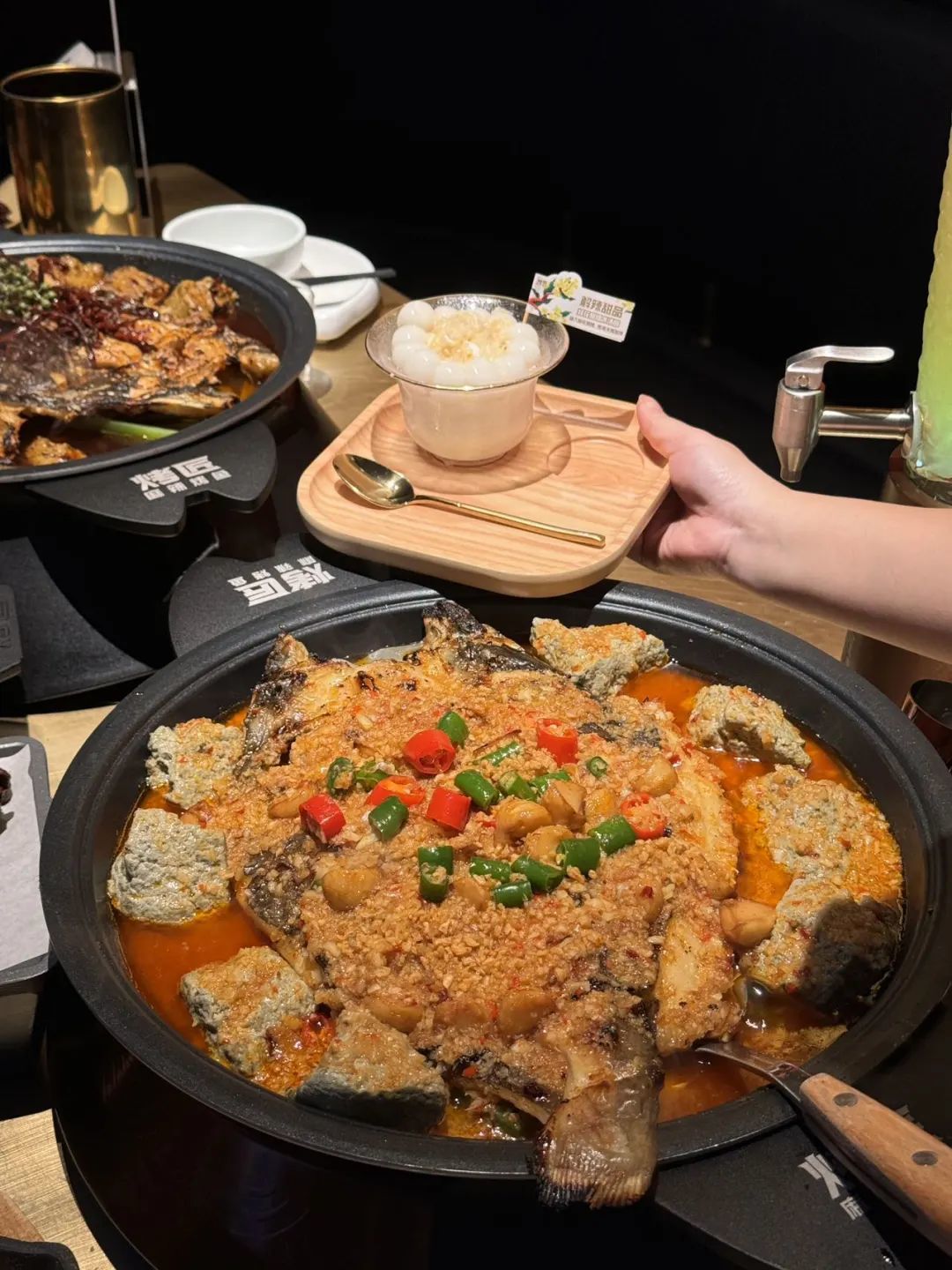 第三个就是餐具:圆形的烤鱼盘。就那个时候全国的烤鱼盘其实都是方形的、长方形的,倒不是说我们为了做不同,而是要同时照顾好鱼和豆花。烤鱼和豆花都需要温度,而豆花放在上面的话,它又破坏了鱼的造型;如果放在那个方形的烤鱼盘放在两侧,然后它四个角受热不均,会影响它的口感。 所以我们最终选择了圆形烤盘。