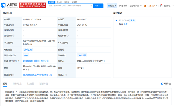 【CNMO科技消息】近日,CNMO注意到,天眼查App公开信息显示,阿维塔科技(重庆)有限公司申请的一项名为“一种车辆的后轮转向控制系统及车辆”的专利已获公布。该专利聚焦于车辆后轮转向系统的智能化控制,旨在通过优化控制逻辑和系统架构,提升驾驶体验与整车稳定性。