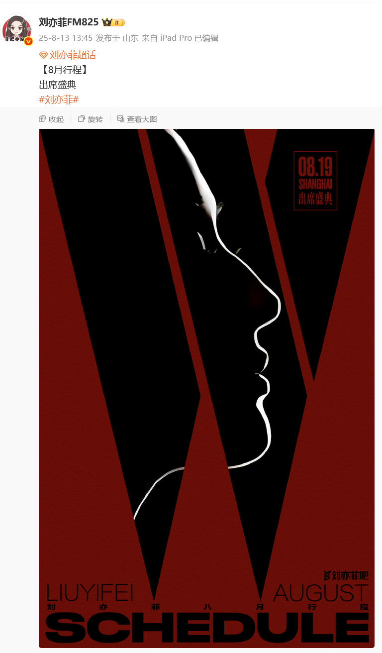 据悉,该盛典活动将于2025年8月19日在上海举行,唐嫣、刘诗诗、迪丽热巴等当红女星也将出席。