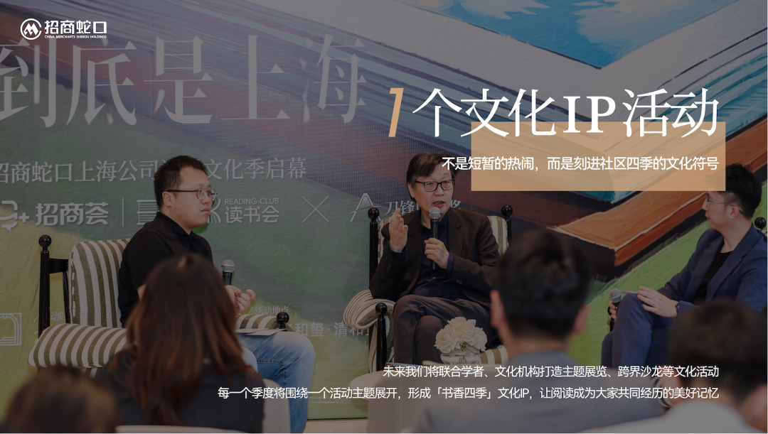未来招商蛇口上海公司将联合学者、文化机构打造主题展览、跨界沙龙等文化活动,每一个季度将围绕一个活动主题展开,形成「书香四季」文化IP,让阅读成为大家共同经历的美好记忆。