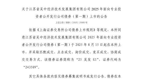 8月14日,上交所发布关于江苏省吴中经济技术发展集团有限公司2025年面向专业投资者公开发行公司债券(第一期)上市的公告。