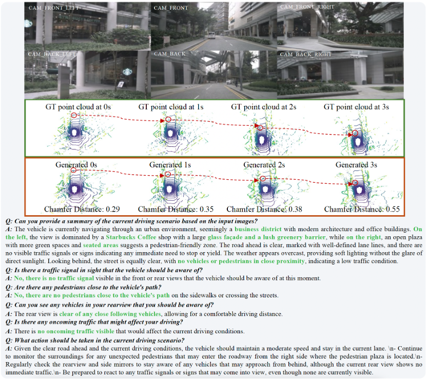 在复杂的城市场景中,HERMES 不仅能准确预测未来三秒的车辆与环境动态(如红圈中标注的货车),还能对当前场景进行深度理解和问答(如准确识别出 “星巴克” 并描述路况)。