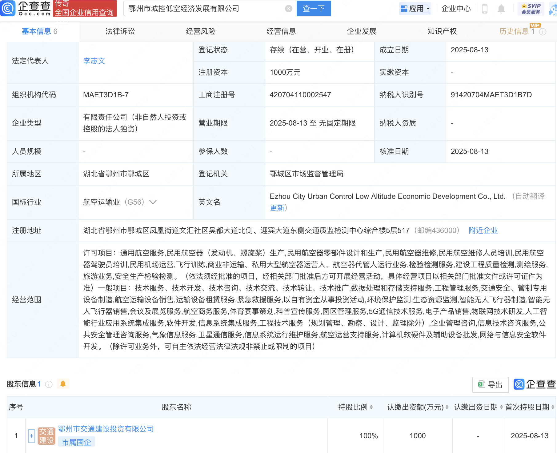 企查查APP显示,近日,鄂州市城控低空经济发展有限公司成立,注册资本1000万元,经营范围包含:物联网技术研发;人工智能行业应用系统集成服务;软件开发;信息系统集成服务等。企查查股权穿透显示,该公司由鄂州市交通建设投资有限公司全资持股。