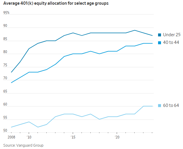 根据先锋领航集团的数据,去年30多岁的美国上班人员中,有多达88%的401(k)账户投资于股票,而十年前这一比例为82%。而60岁出头的401(k)投资者的股票配置比例为60%,也高于十年前的57%。