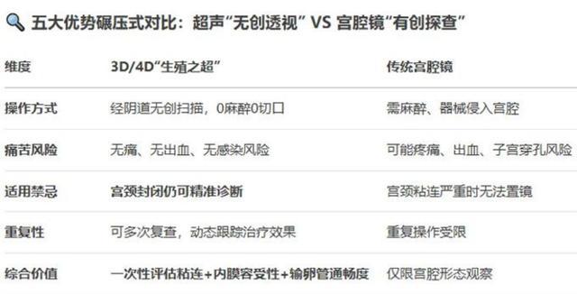 传统宫腔镜虽准,但毕竟是“有创检查”:要麻醉、可能出血、术后得养,对急着怀孕的姐妹来说太折腾。而长沙江湾妇产医院“生殖之超”,简直是为备孕量身定制的“温柔神探”,对比宫腔镜,它的优势让备孕党狂喜!