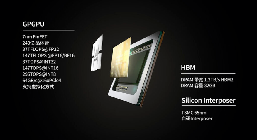 据介绍,天垓100采用业界领先的7nm FinFET制造工艺、2.5D CoWoS封装技术,搭配台积电65nm工艺的自研Interposer(中介层),集成多达240亿个晶体管,整合32GB HBM2内存、存储带宽达1.2TB,支持FP32、FP/BF16、INT32/16/8等多精度数据混合训练,系统接口PCIe 4.0 x16。其中,FP32性能37TFlops(万亿次计算每秒),FP16/BF16性能147TFlops,INT32性能37Tops、INT16性能147Tops,INT8性能295Tops。