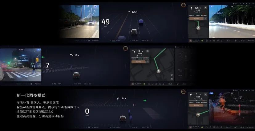 不只是娱乐方面的智能,新一代智己LS6在安全上更是下足了功夫。比如下雨天或者夜晚开车,该车搭载雨夜模式2.0,依靠多个高分辨率摄像头,分布在车身四周,实时采集车辆周边环境图像。经车内计算单元处理,去除雨水干扰,迅速优化画质传输至中控屏,彻底告别盲区焦虑。车辆静止时,自动补足A柱侧后方盲区,低速缓行(低于20km/h)时,扩展至整个车尾侧后方盲区,周边情况一目了然。每当雨夜模式开启后,前风挡除雾和外后视镜加热自动开启,同时胎压信息实时显示,安全这块直接来到下一个level。