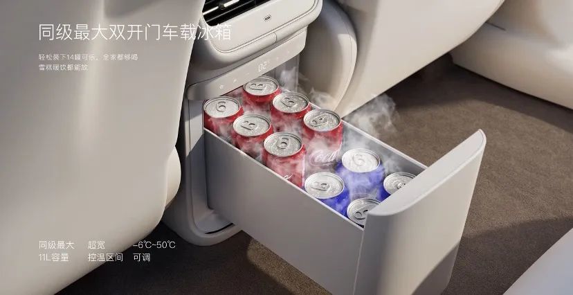 高温天气开车渴了,拉开容积高达11升的双开门冰箱,即刻享受冰饮清凉。