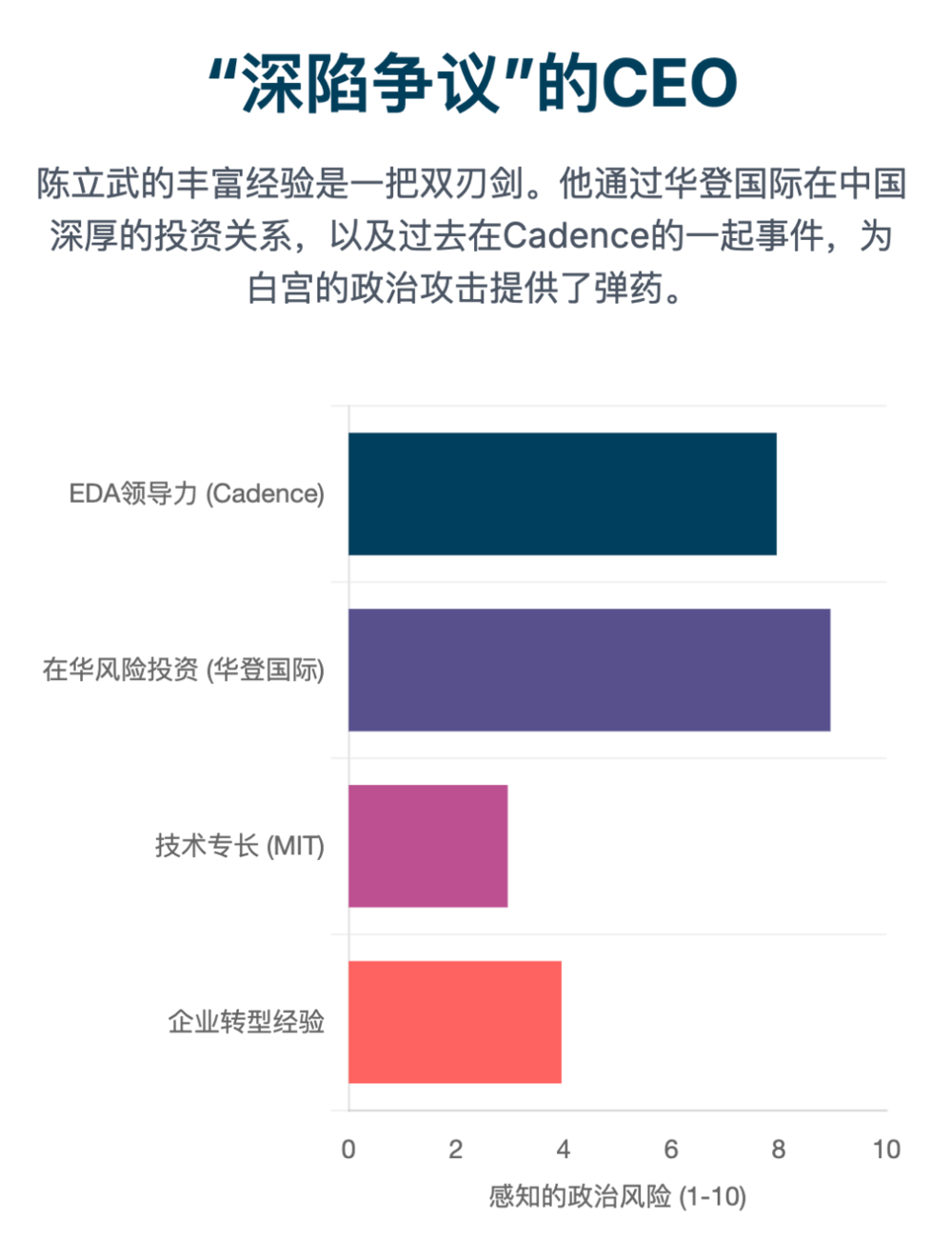 • Cadence的辉煌与污点:在执掌英特尔之前,陈立武的职业高光时刻是长期担任芯片设计软件(EDA)巨头Cadence的CEO。他成功领导了这家公司的转型,使其股价飙升,赢得了业界的广泛赞誉。然而,也正是这段履历,为他埋下了巨大的政治隐患。