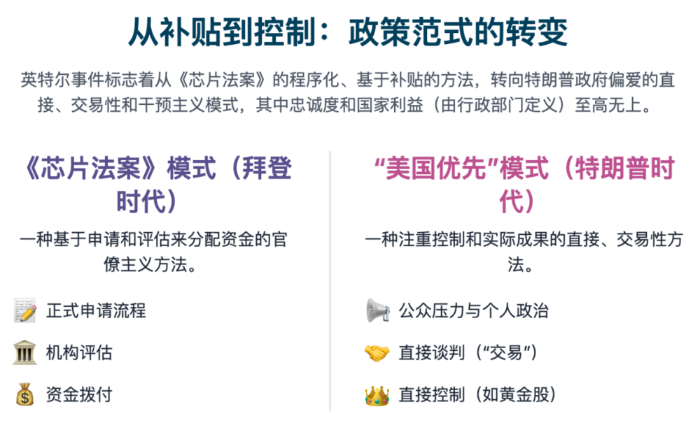 特朗普政府的行动,与此前由拜登政府签署并实施的《芯片与科学法案》,在哲学上形成了鲜明对比。《芯片法案》代表了一种程序化的、基于申请和评估的、相对官僚主义的产业政策模式。企业提交申请,政府部门进行评估,然后发放资金。