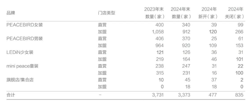 如此背景之下,太平鸟进行大规模门店收缩以求减缓运营压力。从2021年末的5214 家门店,到2024年末仅剩3373家,三年净关1841家,相当于每天关掉1.7家店。
