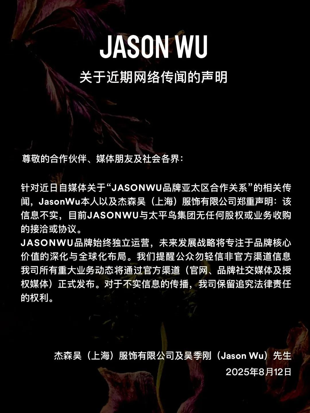 而就在几天后,Jason Wu品牌账号发布声明辟谣,称品牌与太平鸟集团无任何股权或业务收购的接洽或协议,并宣布对于不实信息的传播保留追究法律责任的权利。