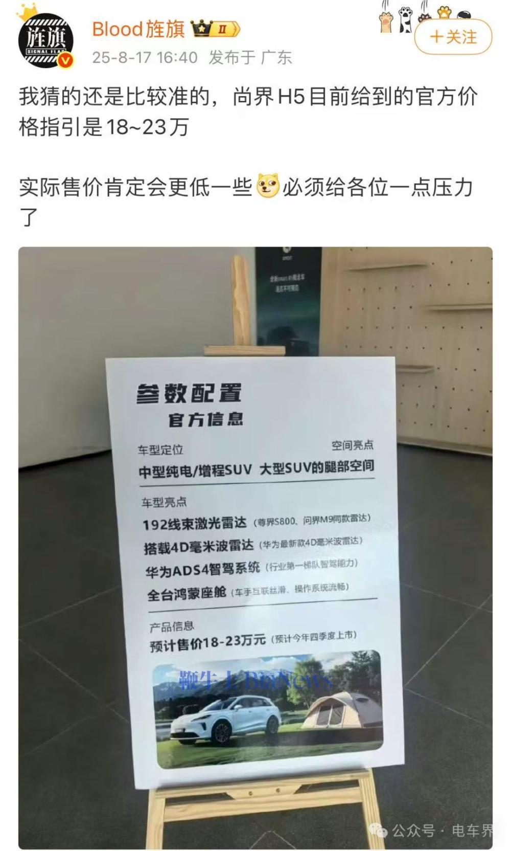 今天,知名汽车博主“Blood旌旗”爆料称,鸿蒙智行即将推出的“尚界H5”,官方给出的价格指引是18万-23万。