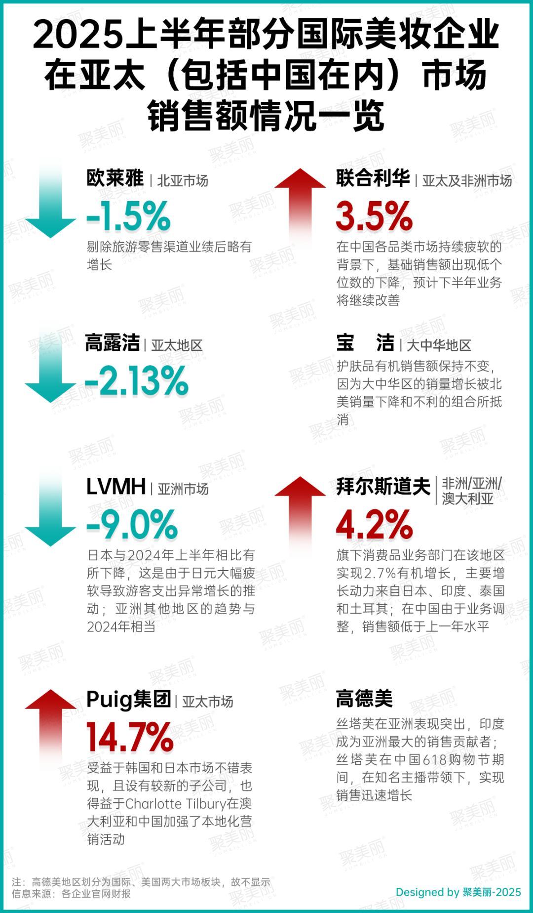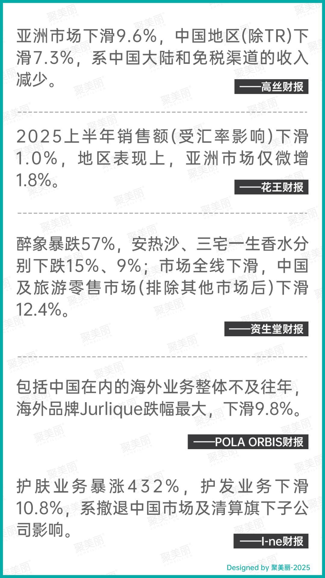 而另一日妆巨头高丝,在2025上半年亚洲市场下滑9.6%,高丝财报显示,由于中国大陆和免税渠道的收入减少,整个地区的收入仍然下降,通过在日本增收来反击亚洲的减收。