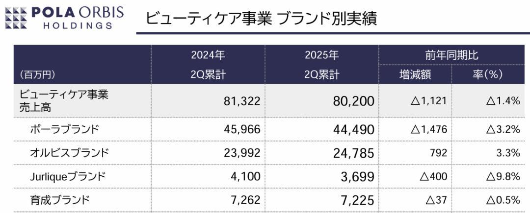 据财报显示,仅除ORBIS销售额同比增长3.3%外,其余品牌均为下滑,尤其主品牌POLA在2025上半年较去年同期销售额已减少14.76亿日元(约合人民币7202.88万元),比整个美容护理业务销售减额还要高,且财报透露,POLA销售额和营业利润均低于去年。
