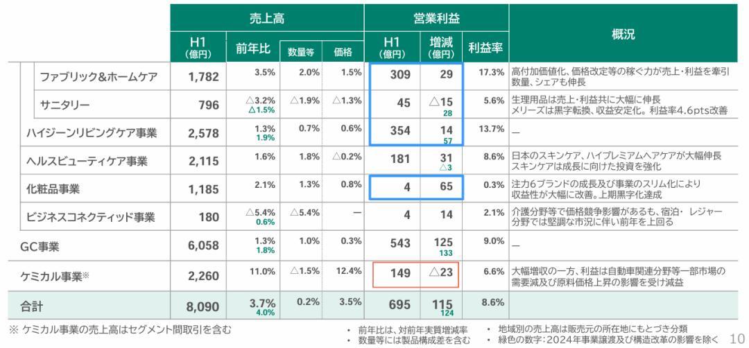 可以看到,与美妆相关的业务2025上半年均呈营利双增,健康美容护理业务增长1.6%,主要原因系日本的护肤和高端护发大幅增长;化妆品业务增长2.1%,受益于通过专注于6个品牌的成长和业务精简。