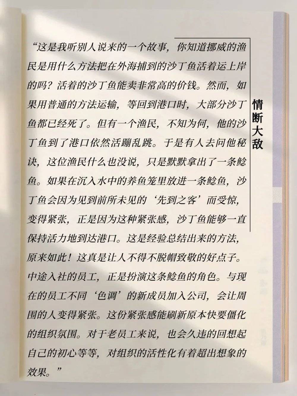 挪威人喜欢吃沙丁鱼,但沙丁鱼非常娇贵,极不适应离开大海后的环境。而有一条渔船,却总能让大部分沙丁鱼活着回到渔港。原来是船长在鱼槽里放进了一条鲶鱼,沙丁鱼见了鲶鱼十分紧张,会不断游动,沙丁鱼就可以这样活着回到了渔港……