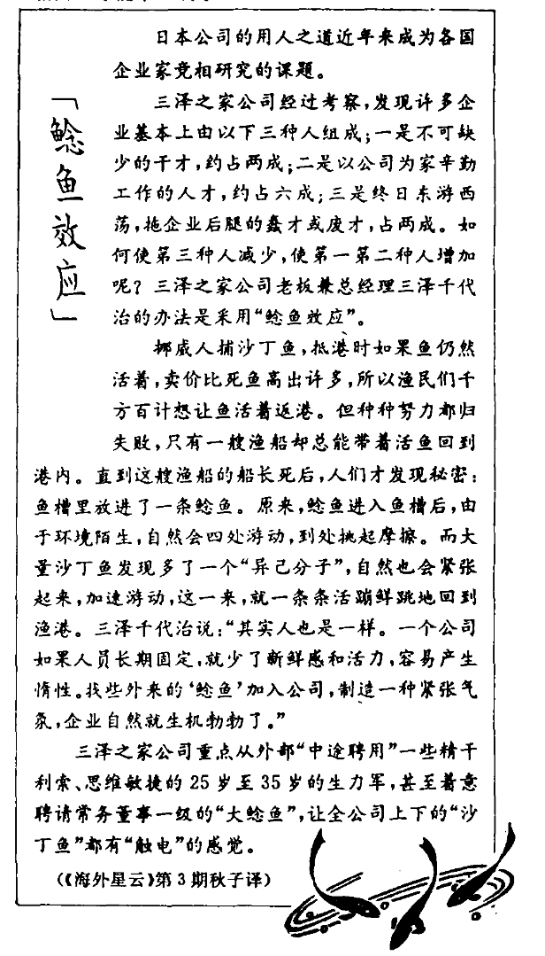 这一篇署名秋子译,发表在《海外星云》,由《中国人才》转发的文章,是关于“鲶鱼效应”可考的最早中文来源。作者不仅介绍了三泽千代治发明的故事,还添油加醋地加入了“蠢材和废材”的说法,并且还增加了鲶鱼“到处起摩擦”这种脱离事实的臆想,背离了三泽千代治的本意(图片来源:中国人才[J]1990.05)