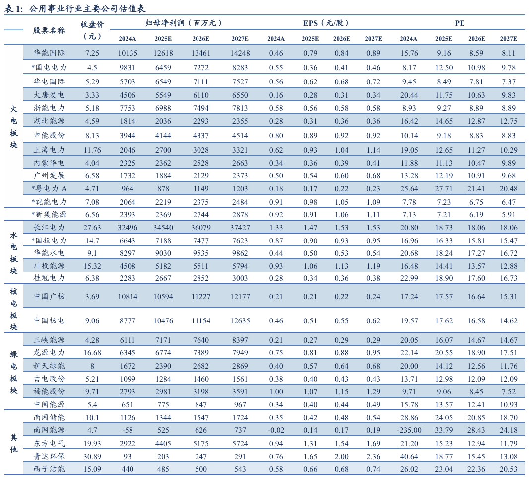 表1:公用事业行业主要公司估值表
