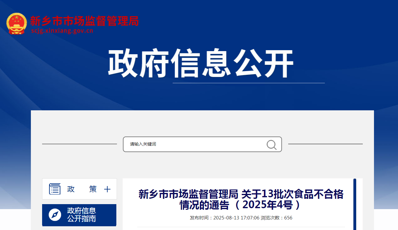 新乡市市场监督管理局关于13批次食品不合格情况的通告(2025年4号)