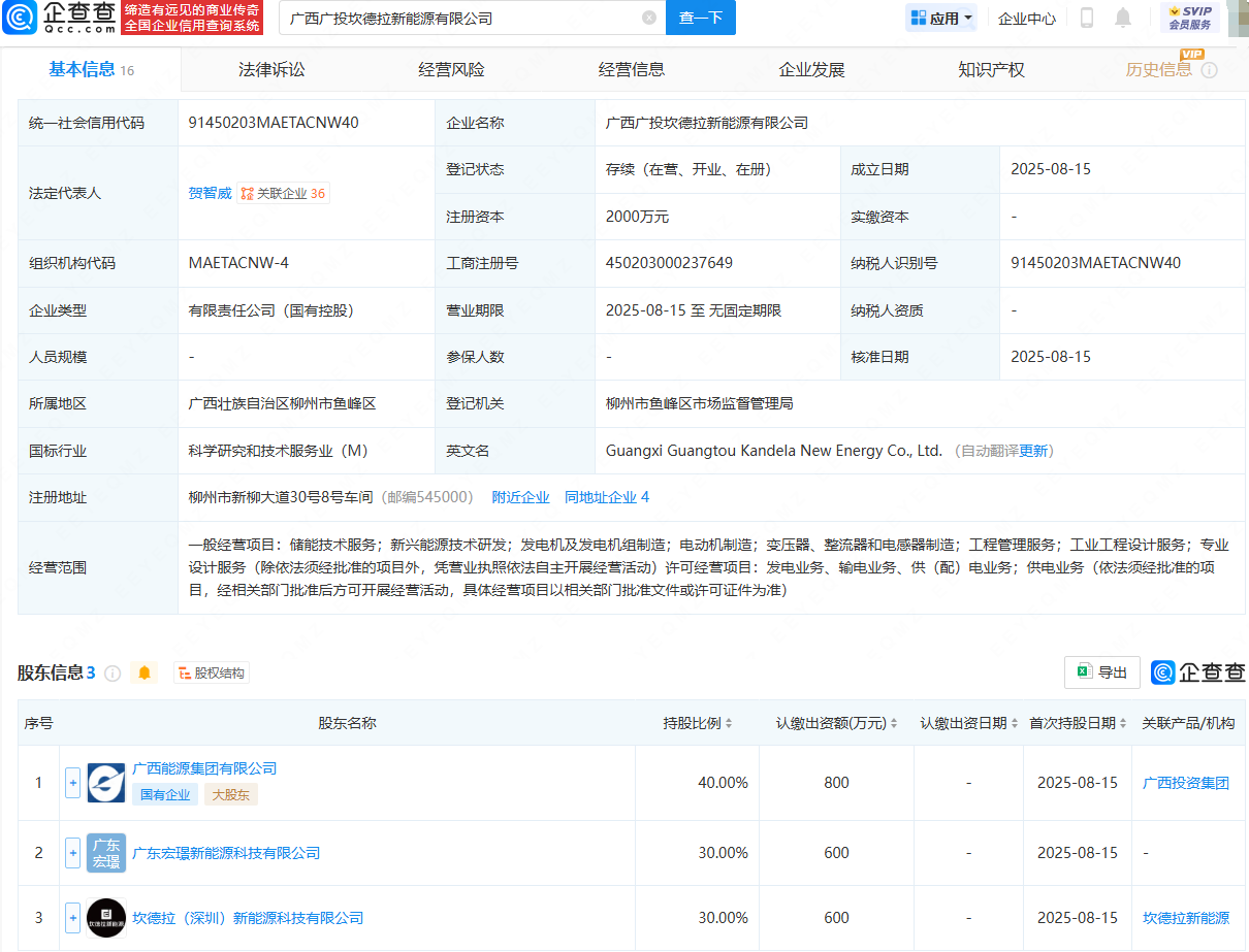 企查查APP显示,近日,广西广投坎德拉新能源有限公司成立,法定代表人为贺智威,注册资本为2000万元,经营范围包含:储能技术服务;新兴能源技术研发;发电机及发电机组制造;电动机制造;工业工程设计服务等。企查查股权穿透显示,该公司由广西能源集团有限公司、广东宏璟新能源科技有限公司等共同持股。