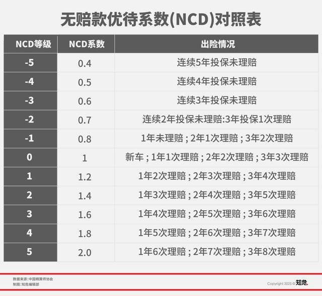 在这个公式中,无赔款优待系数( NCD 系数,no-claim discount )是商业险中为数不多与车主驾驶行为直接挂钩的变量。该系数基于车辆历史出险记录动态调整保费的奖惩机制,不同保险公司执行统一标准,旨在通过“奖优罚劣”实行风险与成本匹配。