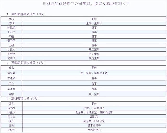 现任董事长吴琼于2012年9月在川财证券登记职业,历任副总裁兼董事会秘书,曾分管债券业务,2023年11月由副总裁升任董事长,接替到龄退休的金树成,金树成此前任中国华电任总经理、党委副书记。