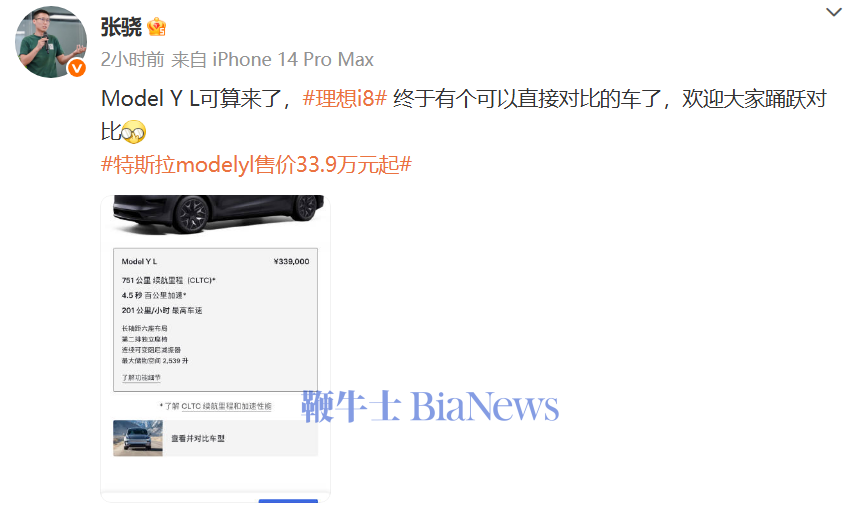 8月19日,理想汽车产品线负责人张骁在微博发文称:“Model Y L可算来了,理想i8终于有个可以直接对比的车了,欢迎大家踊跃对比。”