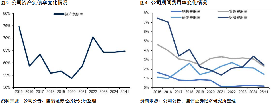 财务数据方面:①截止至2025年半年度,公司资产负债率为64.69%;在手货币资金185.68亿元,同比-2.29%;在手存货201.49亿元,同比+41.76%;公司现金流相对宽裕;②期间费用方面,2025年上半年公司销售费用约6675万元,同比-9.61%,管理费用约8.56亿元,同比-2.62%,研发费用约5.36亿元,同比-24.23%,财务费用约9.12亿元,同比-14.80%,公司通过加速资金周转效率、优化长短期融资结构、精准把握利率窗口期拓展多元化融资渠道等多项举措,带动上半年平均融资成本较上年降低30个基点。