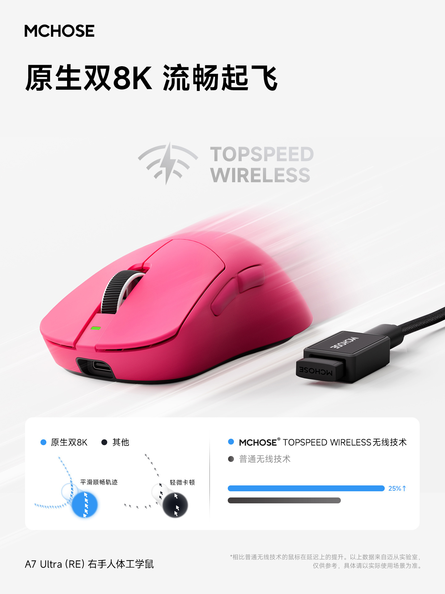 IT之家 8 月 19 日消息,迈从 MCHOSE 本月 15 日推出了面向中大手玩家的右手人体工学鼠标 A7 Ultra (RE)。该鼠标搭载原相 PAW3950 传感器,支持三模双 8KHz 回报率连接,售价 359 元。
