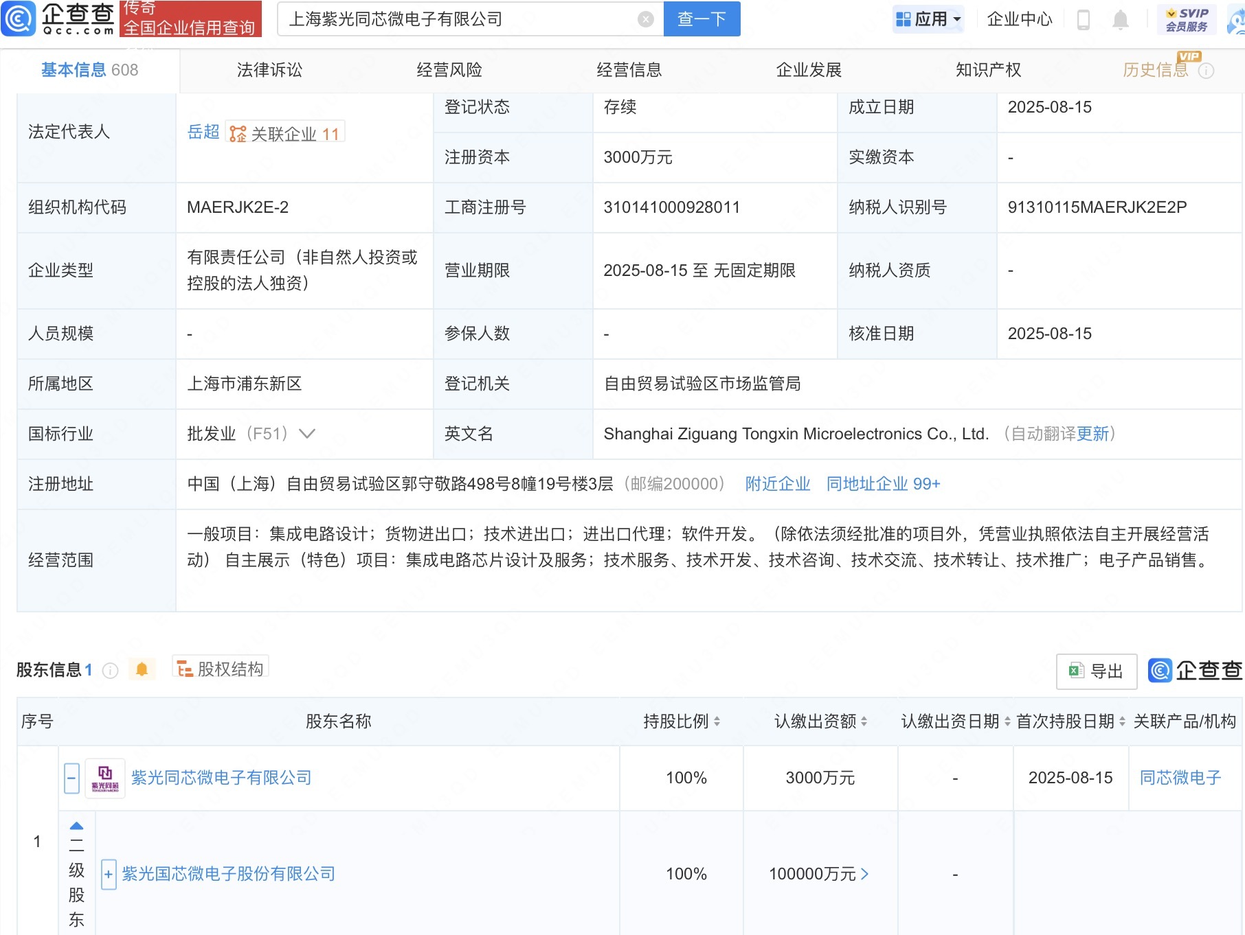 企查查APP显示,近日,上海紫光同芯微电子有限公司成立,法定代表人为岳超,注册资本3000万人民币,经营范围含集成电路设计、货物进出口、技术进出口、集成电路芯片设计及服务等。企查查股权穿透显示,该公司由紫光国微(002049)间接全资持股。