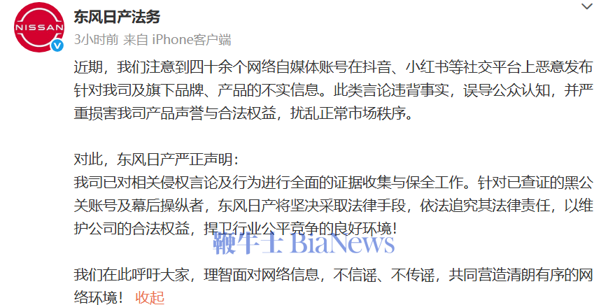 8月19日,东风日产法务部发文称,近期注意到四十余个网络自媒体账号在抖音、小红书等社交平台上恶意发布针对该公司及旗下品牌、产品的不实信息。