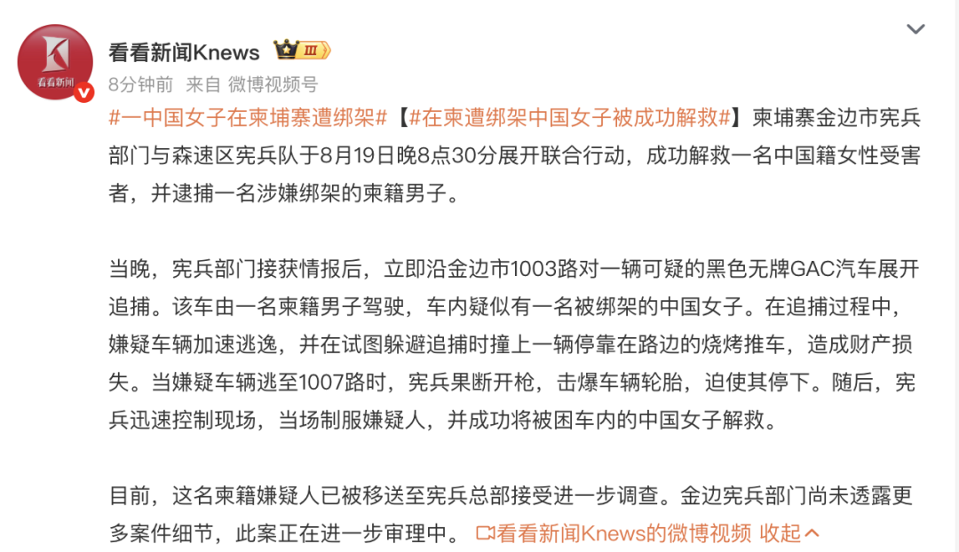 据看看新闻Knews报道,柬埔寨金边市宪兵部门与森速区宪兵队于8月19日晚8点30分展开联合行动,成功解救一名中国籍女性受害者,并逮捕一名涉嫌绑架的柬籍男子。