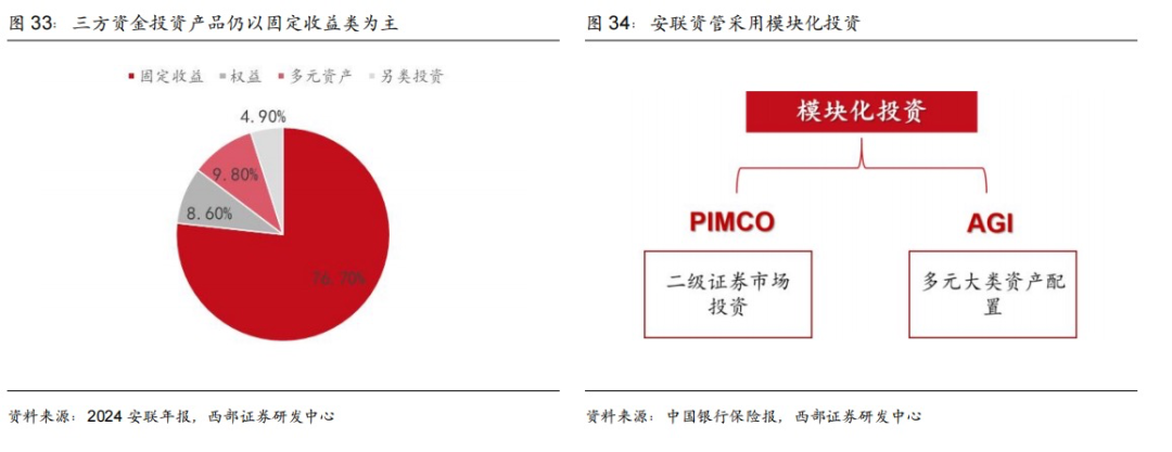 投资结构以固定收益类为主。2024年安联固定收益类产品配置占比76.7%,较2023年提升0.3pct;其次为多元资产占比9.8%,权益类和另类投资分别占比为8.6%和4.9%。