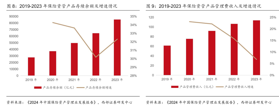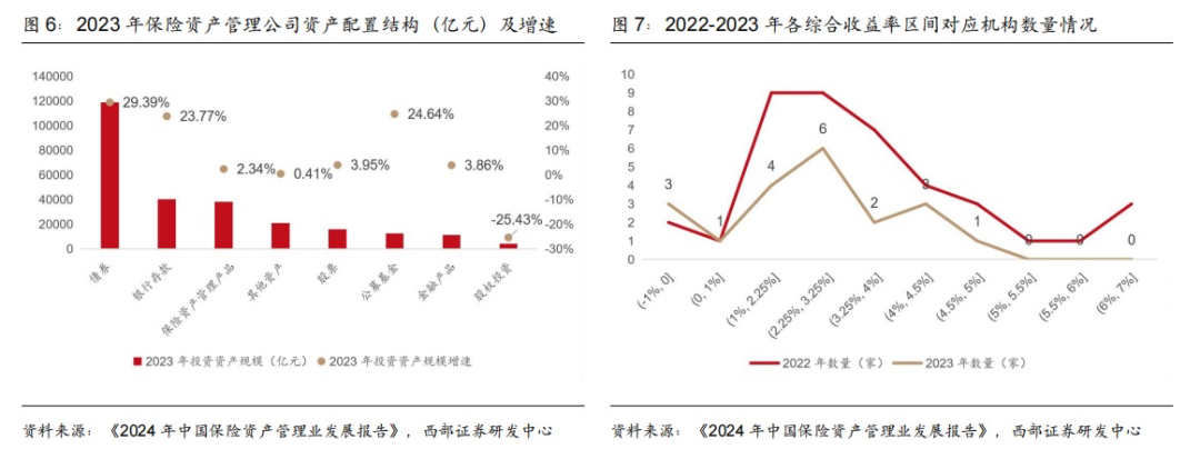 保险资管公司偏好固收类资产。由于行业内主要资金来源为险资,而险资主要由保险公司自有资金+保险责任准备金构成,对资金安全性尤为看重。故保险资管对于高波动的权益投资较为谨慎,偏好安全性与流动性较好的固收类投资,2023年债权、银行存款、公募基金的增速较高。