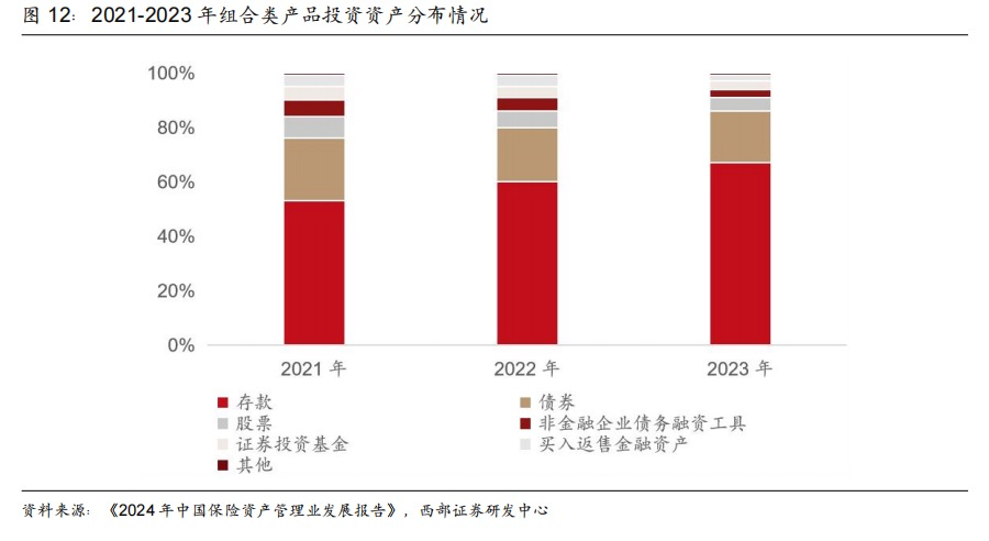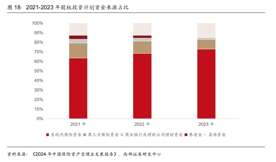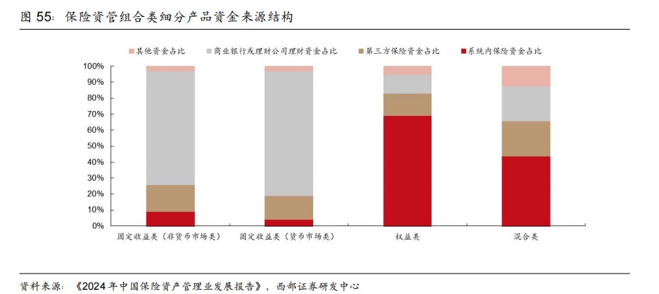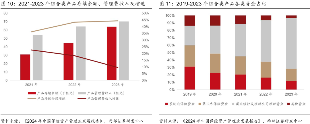 组合类产品中第三方资金占比持续提升。组合类保险资管产品中非系统内资金的第三方资金(即第三方险资+银行资金+其他资金)占比持续提升,从2019年的69.1%提升至2023年末的88.3%。目前第三方资金规模逾5.63万亿元,组合类产品市场化程度进一步提升。