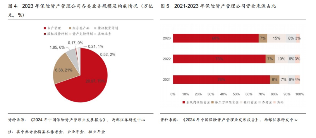保险资管机构的资金来源高度集中,以险资为主。保险资管行业的资金来源分为险资与非险资。其中,险资是保险资管行业主要资金来源,包括了体系内险资与第三方业内险资,2023年险资合计占比约74%;非险资包了银行资金、基本养老金、企业年金、职业年金以及其他资金。