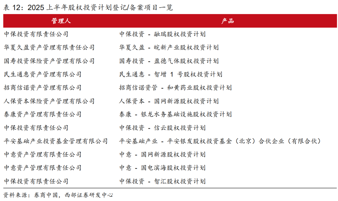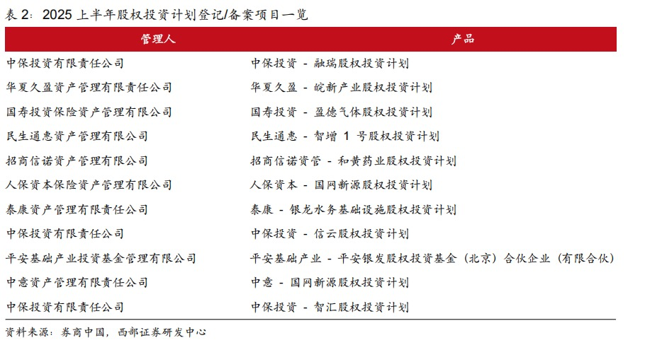 资金对项目收益稳定要求较高,系统内险资仍占主要地位,项目多投向新质生产力领域。部分私募基金出资人中也有地方国资以及社保基金会身影,例如,国寿金石登记的云南新能股权投资基金,于2024年8月落地,总规模达到100.04亿元,其中云南省能源投资集团出资50亿元,全国社保基金理事会出资38亿元,国寿投资公司受托国寿财险公司出资12亿元。保险资金发挥规模大、周期长、来源稳定的优势,在金融“五篇大文章”、新质生产力等方向落地项目增多。2025年上半年新成立的由保险资管公司做管理人的股权产品中,多个投向了科技、绿色发展、现代化产业体系建设等领域。