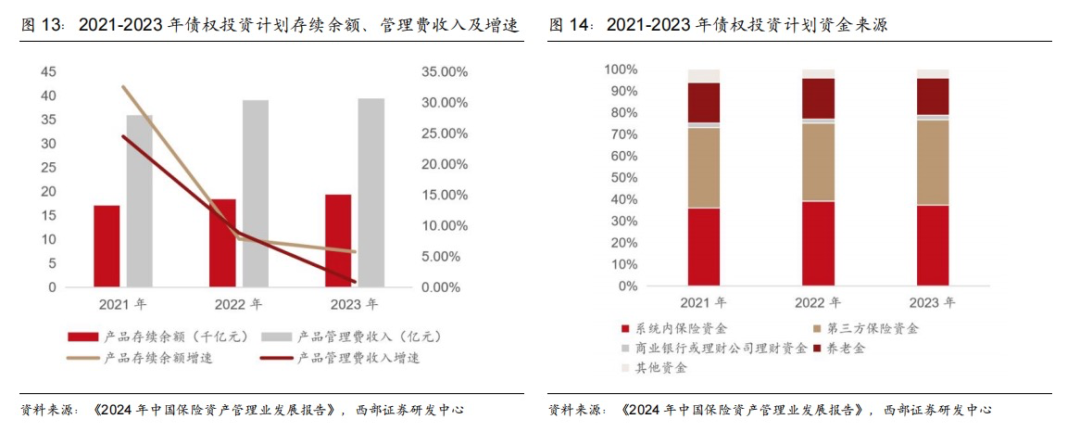 债权投资计划已连续三年收缩。2024年债权投资计划的登记数量和登记规模均较2021年高峰减少三成左右,已经连续三年收缩;2025年以来继续下降,上半年登记规模不足2024年全年规模的35%。主要系经济周期进入新阶段,传统项目需求萎缩,资产荒加剧。从资金来源看,2023年险资占比为76%,另外养老金占比17%、商业银行或理财公司理财基金占比仅2%。