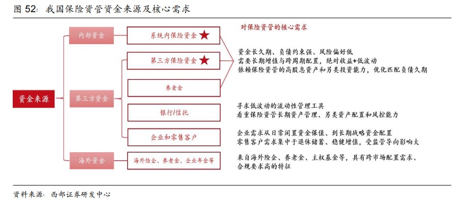 第三层-固收类信托及保险资管等非标:保险资管主要服务机构资金,侧重长期配置,信托在C端和B端均有,给予投资人相对稳健但具有一些弹性的回报;