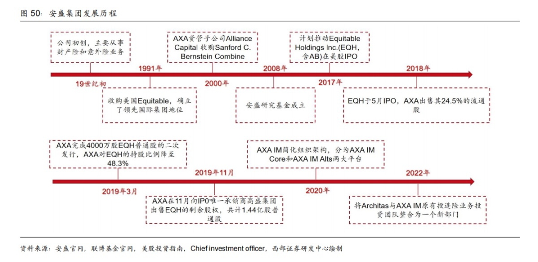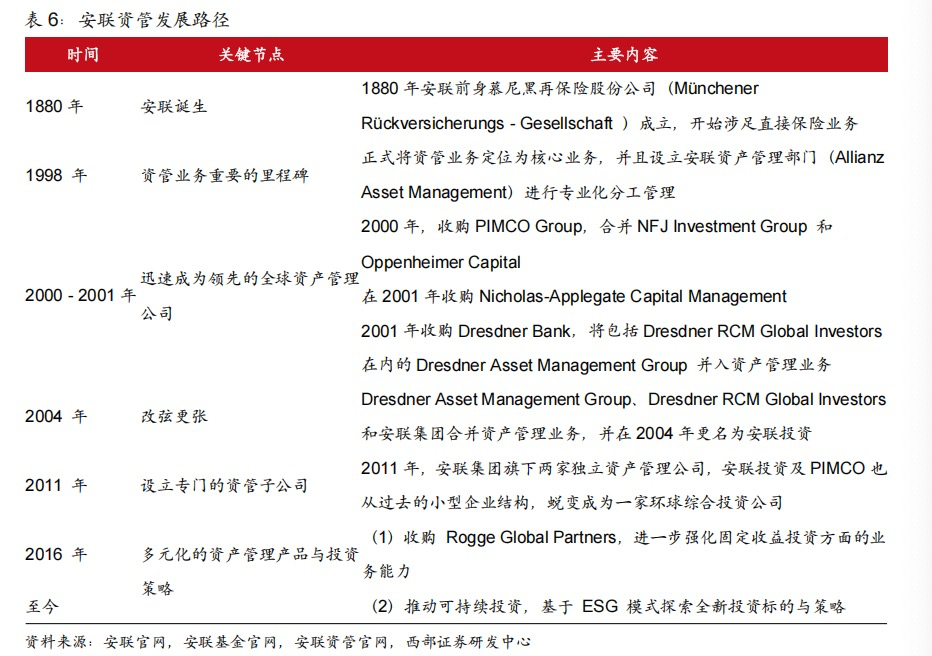发展路径以外延并购+资源整合为主。发展路径:首先为保险集团提供专业化的资产管理服务,然后不断扩大第三方资产管理规模,最后通过全球范围内的并购与重组快速提升资管能力,提供各具特色的全球资产管理服务。