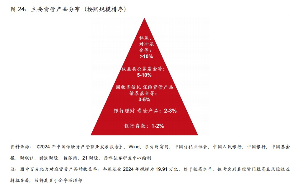 第二层-银行理财和寿险产品:承接大众稳健增值需求,收益与固收市场强相关。2024 年受“资产荒”影响收益小幅下行,是居民“风险偏好升级”的核心过渡产品;