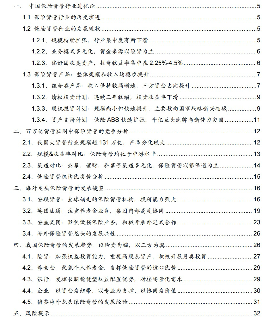 主要逻辑:1.我国保险资管行业发展历经三阶段:2003年保监会审批设立保险资管公司,行业开始起步;2012-2017年政策逐步放宽,推动业务多元化发展;2018年以来市场化改革加速,竞争力逐步提升。发展现状:规模持续扩张,但集中度有所下降;资金来源以险资为主(占比74%),专户业务占比70%;投资偏好固收类资产。产品构成:组合类产品占比75.3%,债权计划连续三年收缩,股权投资计划与资产支持计划增速显著,发展空间广阔。