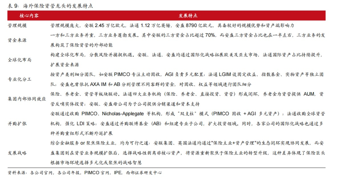 全球领先保险资管机构普遍具备管理规模庞大、三方业务驱动强、全球化布局完善等特征。例如安联、法通、安盛三大巨头均依托保险集团资源,通过发展三方业务显著提升资产管理能力,三方资金占比普遍超过50%,形成保险主业与资管业务协同发展的双轮驱动。同时,这些机构积极构建全球化资产配置体系,分散风险、拓展资金来源。在专业化方面,则按照资产类别建立精细化投研团队,如安联旗下PIMCO专注主动固收、AGI主打多元配置,强化多元产品供给与主动管理能力。此外,收购并购也是其扩张的重要手段,如安联通过并购PIMCO、Nicholas-Applegate等形成“固收+多元”双支柱模式。总体来看,国际保险资管巨头正向“综合金融服务平台”或“聚焦特色资管主业”两种模式演进,以实现穿越周期的持续增长。