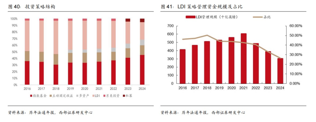 3)负债驱动型产品创新(LDI)的全球标杆:通过衍生品对冲+主动增值的双层架构,对冲养老金利率的能力行业领先,近年来积极适应市场环境变化,持续加强风险管控,向多元化配置加快转型。